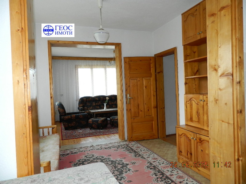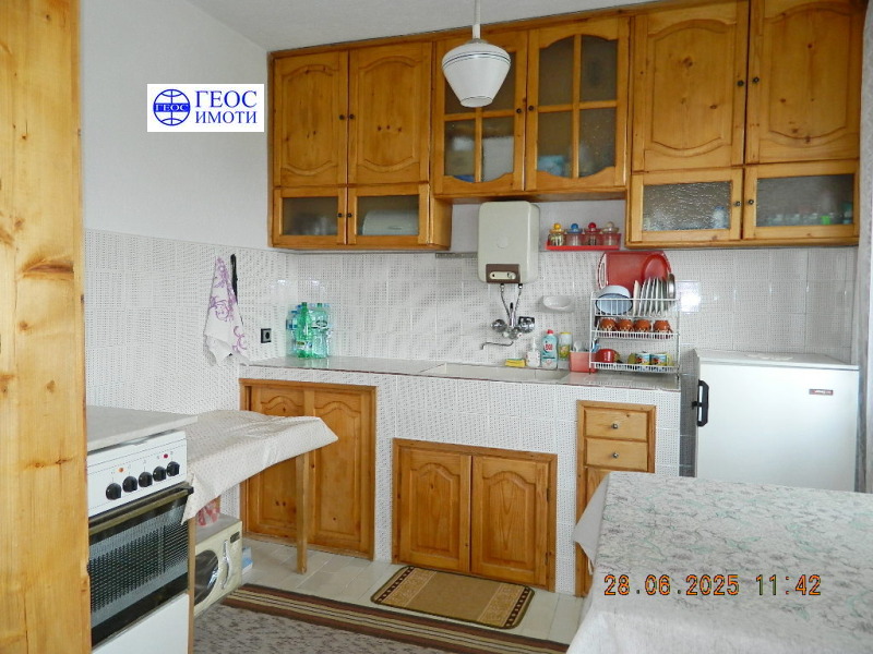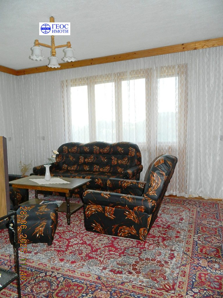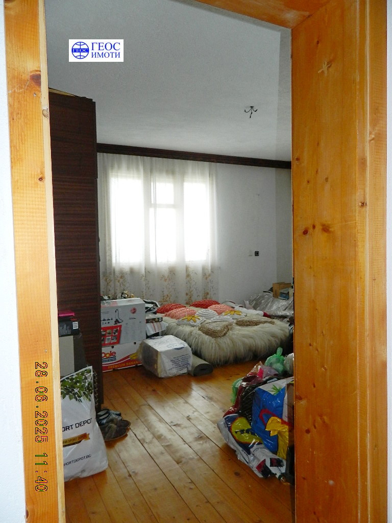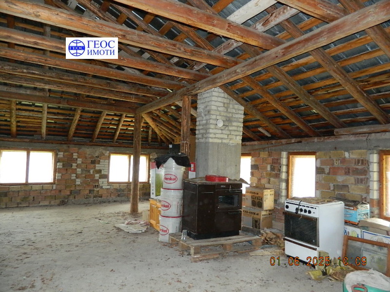 дървена дограма на прозорци. Довършителните работи на втория етаж са следните дървени подови настилки навсякъде, масивни дървени врати, дограма дървена, двойна, отоплението е чрез котел на твърдо гориво и радиатори във всички помещения, вътрешна и външна мазилка. Етажът се продава с обзавеждането. Изложение юг, изток и запад. В цената влиза и ½ ид. част от застроен и незастроен поземлен имот, целия с площ 980 кв.м., както и избено помещение с площ ок. 15 кв.м.