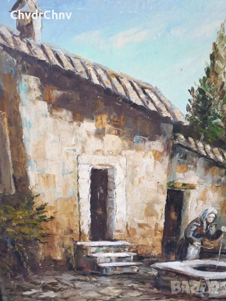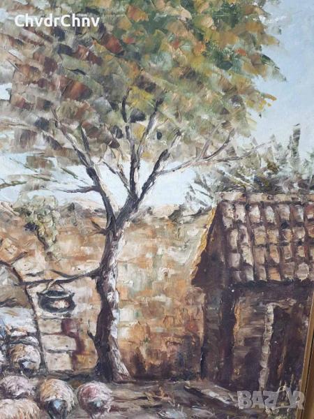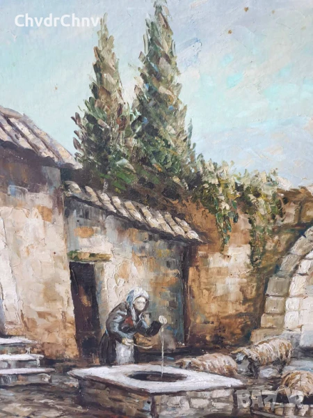131х81см/стара голяма картина масло върху платно/къща-двор-овце-кладенец/барокова дървена рамка