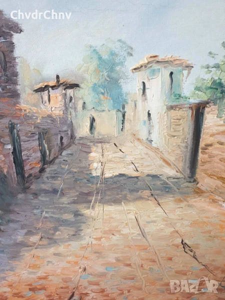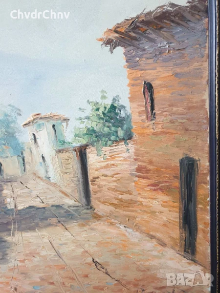 150х89см/стара голяма картина масло върху платно/испанско село-каменни къщи/барокова дървена рамка
