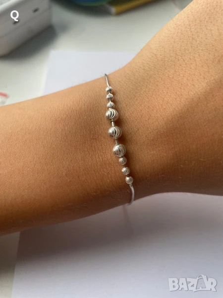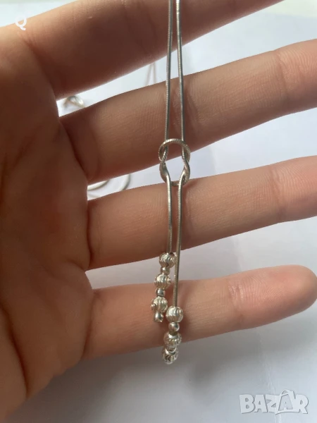 Сребристо бижу в два елемента — гривна и колие. И двете са с гладки вериги тип „змия“ и украсени с малки сребърни топчета. Колието има висящ елемент с каскадно подредени топчета, а гривната е със закопчалка тип „щипка“. Стилен и минималистичен дизайн.