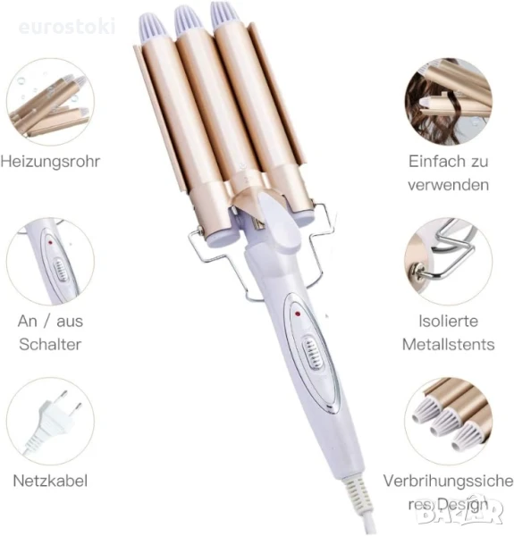 Тази маша с три барабана е идеална за всички типове коса, независимо дали е къса или дълга, гъста или тънка. Нагрятата керамика произвежда отрицателно заредени йони, които създават меки, блестящи вълни без накъдряне. За разлика от пресите за оформяне с един барабан, на които им отнема много време, за да направят къдрици, тази маша с три барабана ви позволява да завършите оформянето за минути.