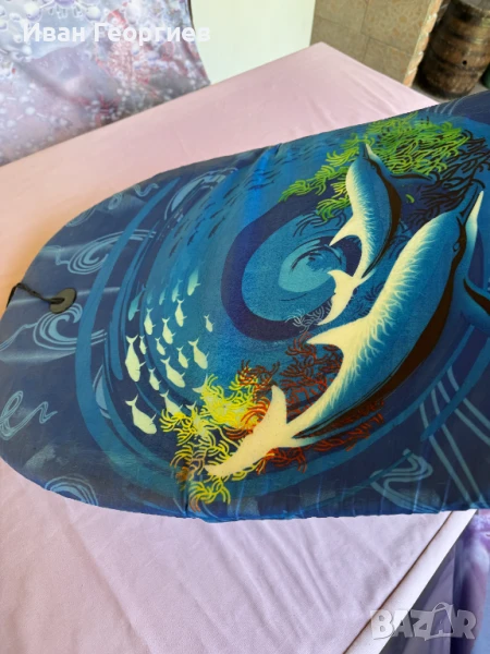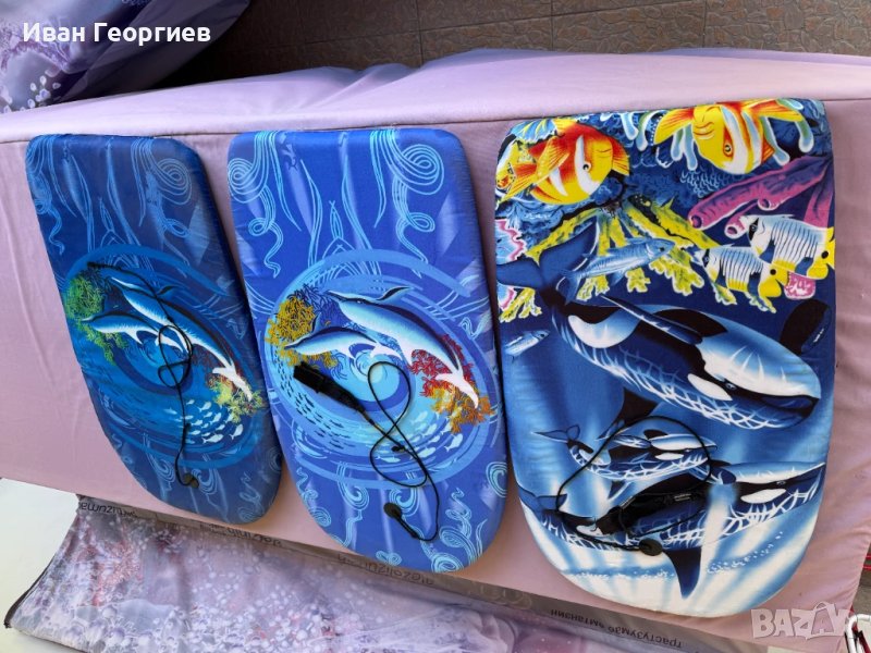 Продвам 2бр употребявани детски дъски за плуване с габаритни размери 80х43х3 см, които имат връзка за ръка против изгубване. Основата е от така наречения стиропор, а от горе е облечен с текстил.