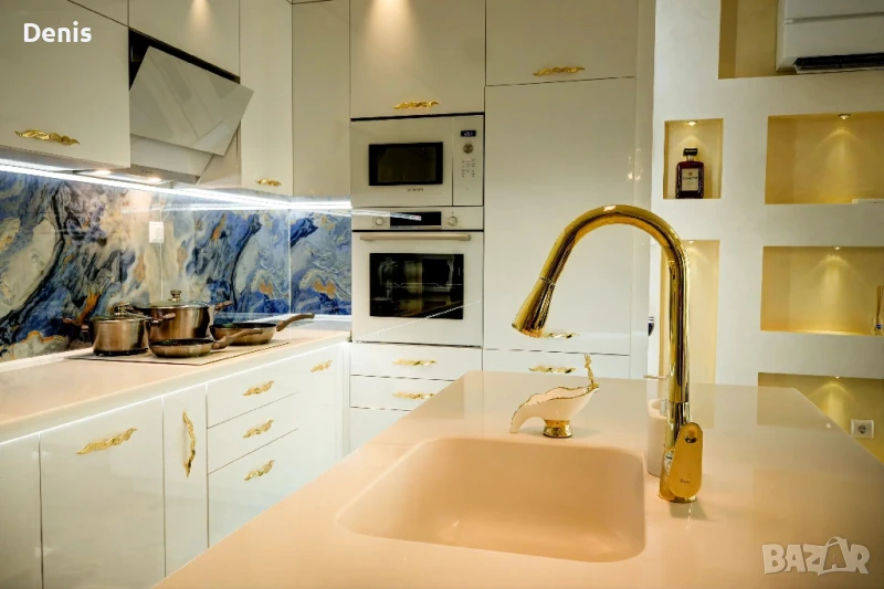 Кухня с остров оборудван, BOSCH, вградена печка с фурна, микровълна ,ширма, миялна, пералня с сушилна 2 в едно, хладилник,