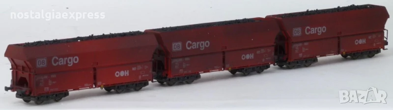 Композиция от ДБ карго три четири-осни Хопер вагона, червени на цвят с отварящи се капаци, производство на Механо, мащаб 1:87 ( НО ). Вагоните са употребявани, в много добро състояние. Съвместими са със