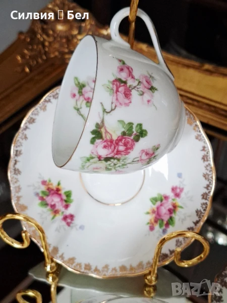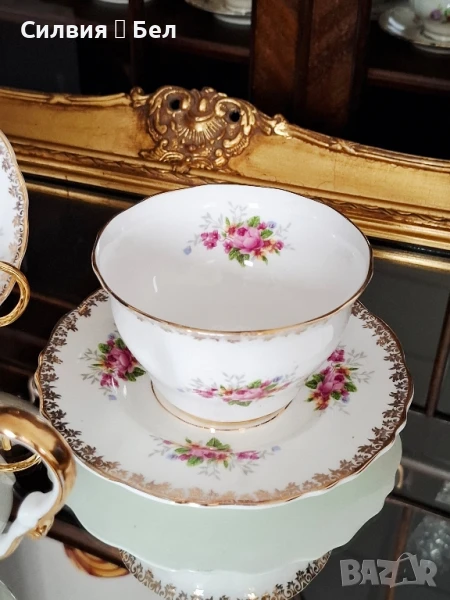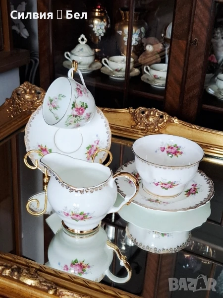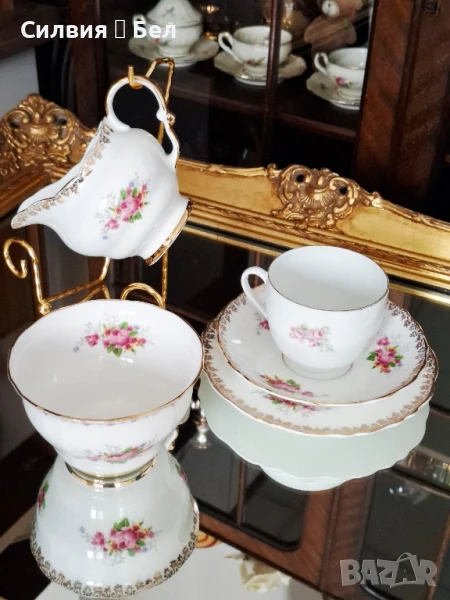 костен порцелан. 1960г.⚜️ Троен сет с различна чаша. Отворена захарница или бонбониера и Латиера.Вместимост на чашата 200мл. Диаметър на чинийките 14 и 16см. 🌸Обща цена 6️⃣0️⃣лв.🌹..•´¨) ¸.•¨)🌱... (¸.•¨¯`*•.🍃🌹🍃В стил, който често се асоциира с периода на Регентството (Regency period), характеризиращ се с елегантност и класически мотиви. Въпреки че "Regency" не е марка, а по-скоро исторически период и стил, дизайнът на сервиза с флорални мотиви и златни кантове е типичен за естетиката от това време.