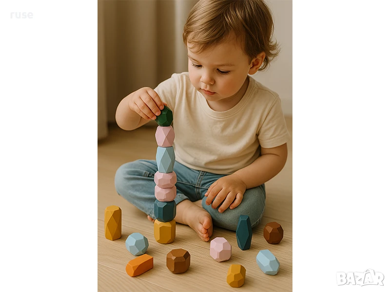 Развийте въображението, сръчността и координацията на вашето дете с този красив комплект от 20 цветни дървени камъка. Идеален за свободна игра, строене, сортиране и учене чрез забавление!