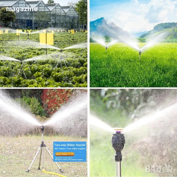 Градински разпръсквач с телескопична опора на статив .- Автоматично въртяща се дюза - Устройство за капково напояване- Размери на височина от 53 см до 90 см- Размери на ширина 50см