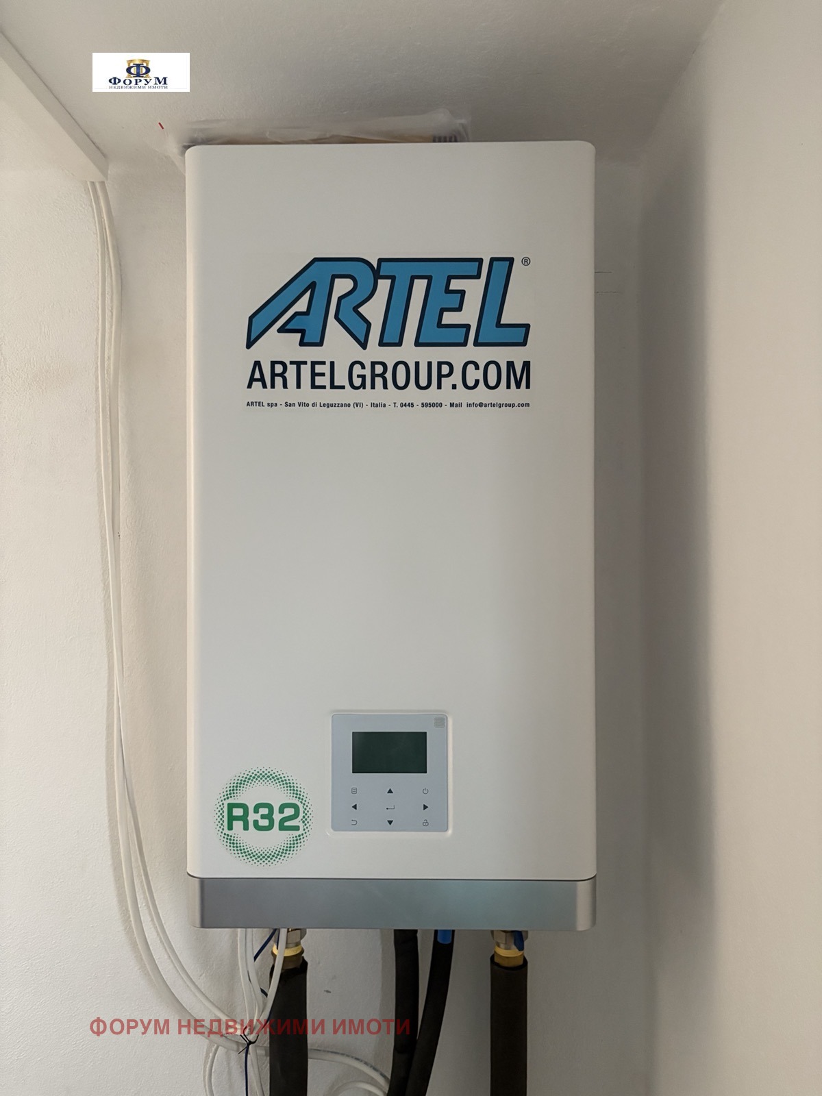 Термопомпата е италианска ARTEL. Отоплява цялата къща с нисък разход за електричество.. През слънчевите дни се ползва слънчева батерия за бойлера с вместимост 200 л. Изолацията на къщата е 10см и под нея има 6см мраморнa мазилка.