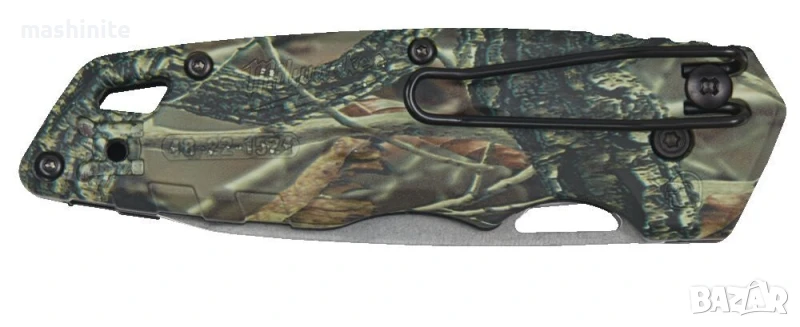 Универсален сгъваем нож с камуфлажна дръжка и гладко острие от неръждаема стомана с остър връх. Специална заключалка Liner Lock закрепва острието в отворено положение. За носене на колан е предвидена здрава щипка, а за закрепване на ремък при работа на голяма височина има отвор. Обща дължина 190 мм, дължина на острието 72 мм.