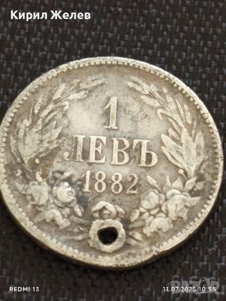 Сребърна монета 1 лев 1882г. Княжество България продупчена за НАКИТ, НОСИЯ, КОЛЕКЦИЯ 46996