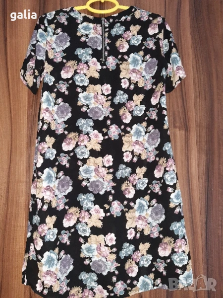 Продавам рокля в размер M, с цип на гърба. Без подплата. Полиестер. Дължина 90см. Подмишници 50см. Талия 52 см.Ханш 54см.