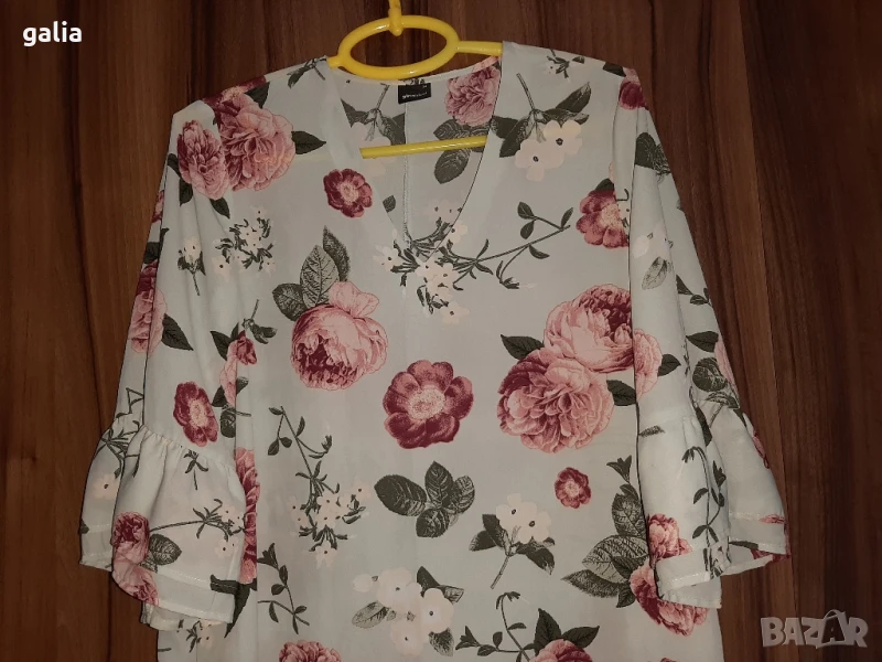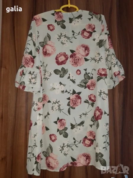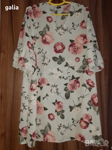 Продавам рокля в размер M,L/ на етикета пише размер34, но роклята е според мен по- голям размер/. Без подплата. Полиестер. Дължина 89см. Подмишници 50 см. Ханш 57 см. В отлично състояние.