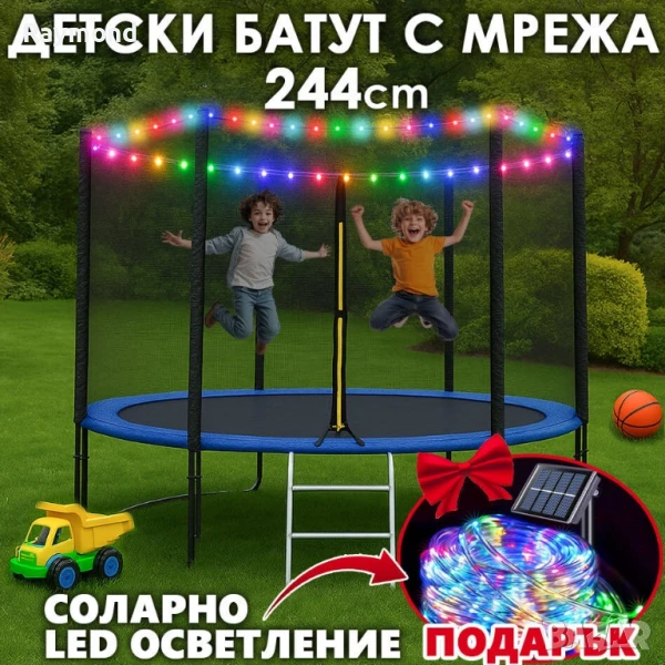 Детски батут с мрежа 244см с ПДОАРЪΚ LED Лампички – Подсилена конструкция и UV защита