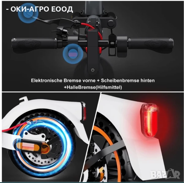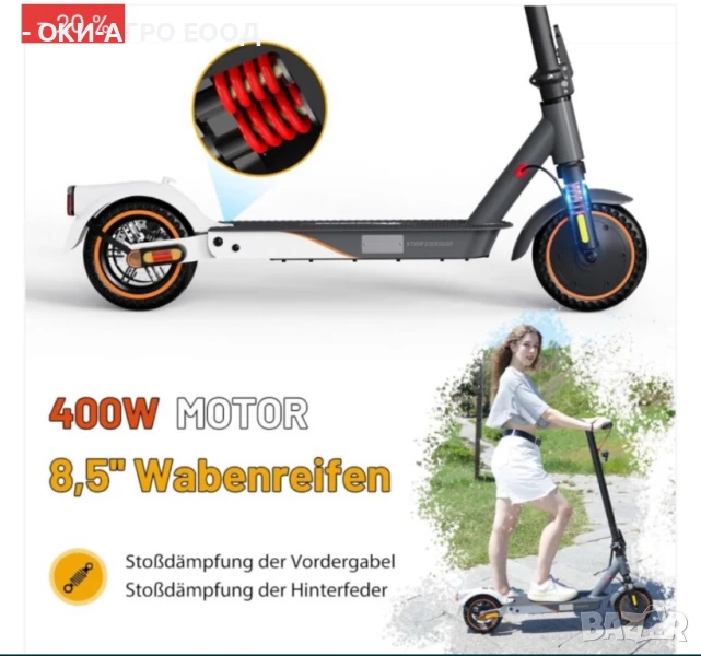 На вашето внимание, предлагаме изключително удобен, здрав и надежден електрически скутер-тротинетка на Немската марка : EVERCROSS : EV 85 F - ABE 400W : 36V : 7.8 Ah - 8,5 инча гуми - предни и задни амортисьори. Дискови и Eлектрически ABS спирачки. + Автопилот система.
