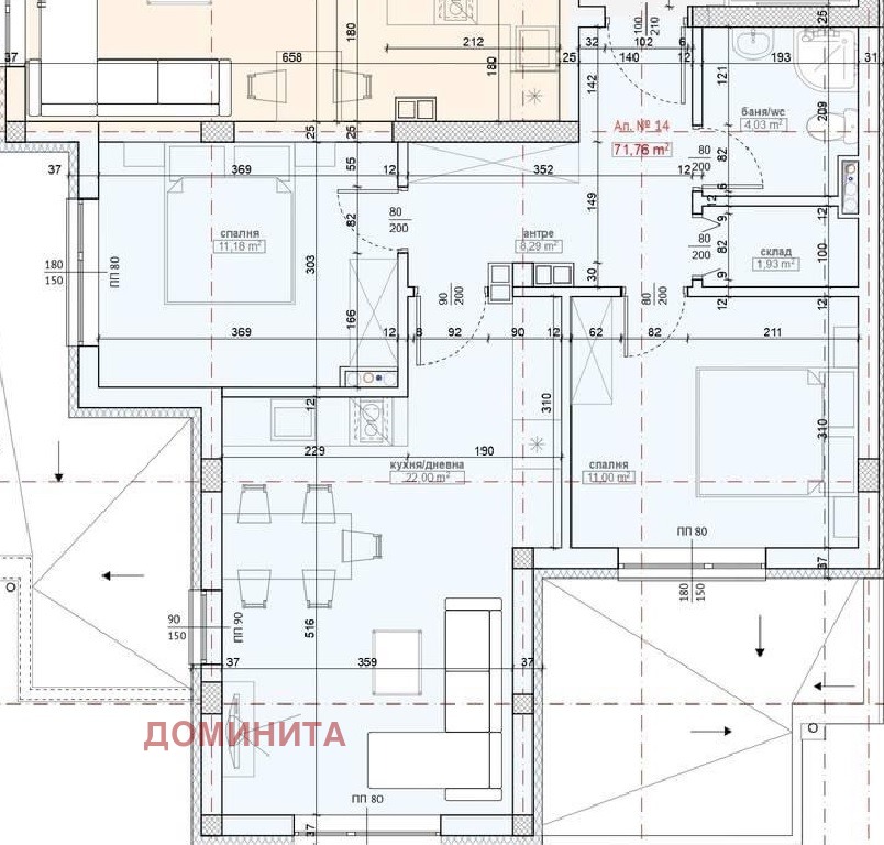 Обща площ 86.35 кв.м. (нетна площ 71.76 кв.м. + общи части 14.59 кв.м.).