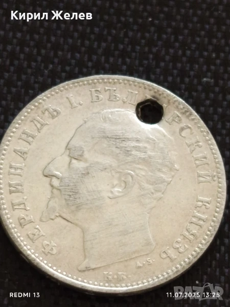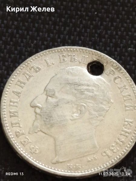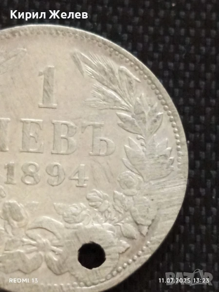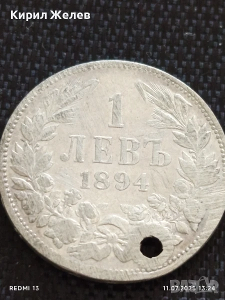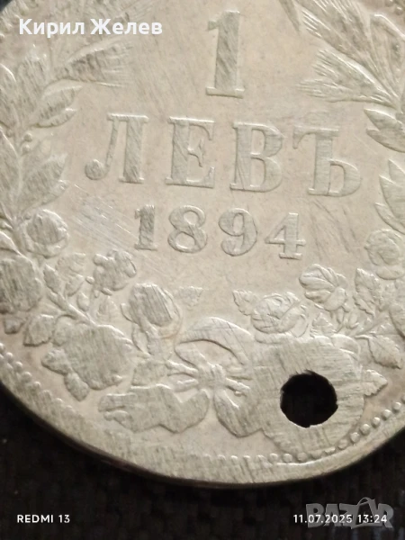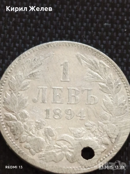 Сребърна монета 1 лев 1894г. Княжество България продупчена за НАКИТ, НОСИЯ, КОЛЕКЦИЯ 26179 → Обява 50986276