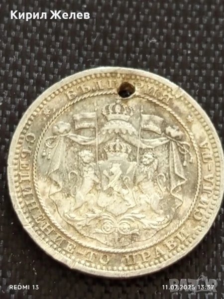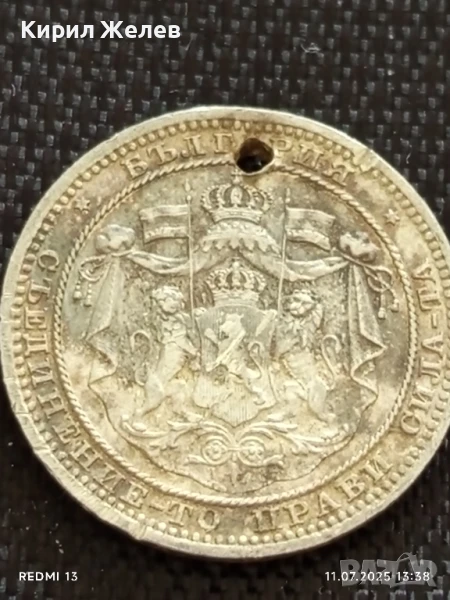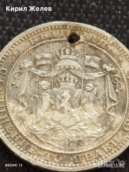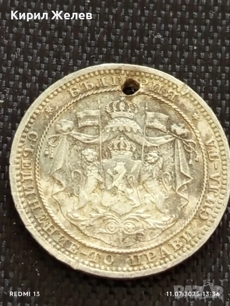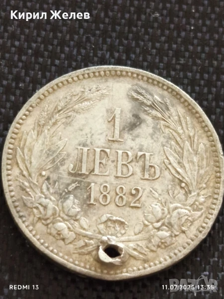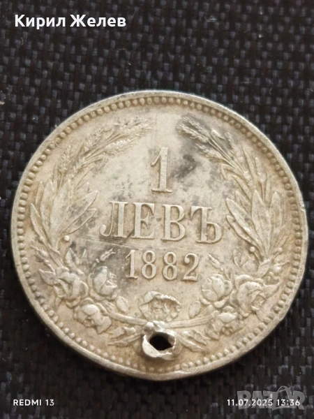 Сребърна монета 1 лев 1882г. Княжество България продупчена за НАКИТ, НОСИЯ, КОЛЕКЦИЯ 29718