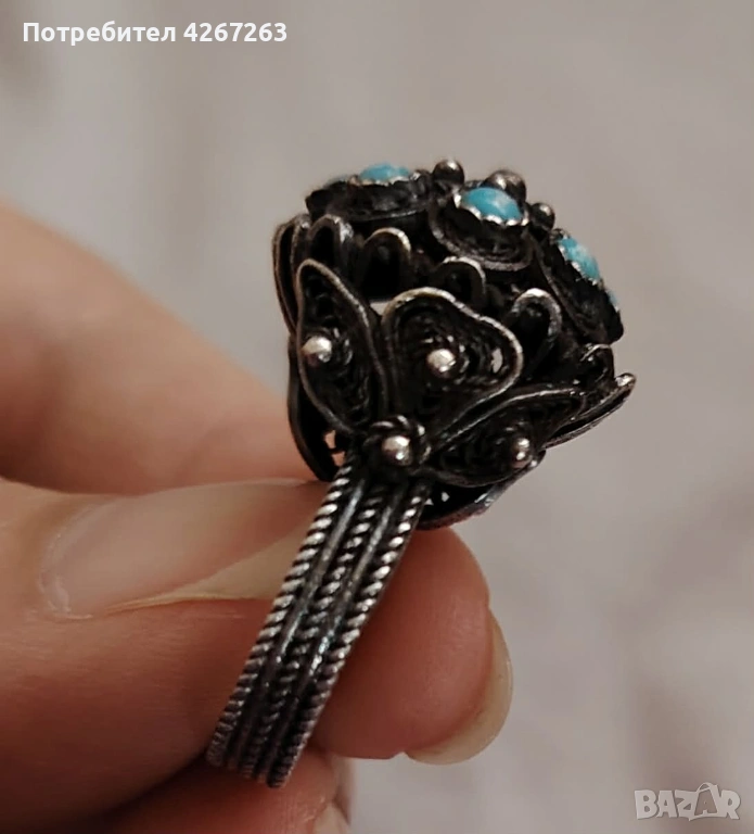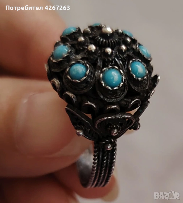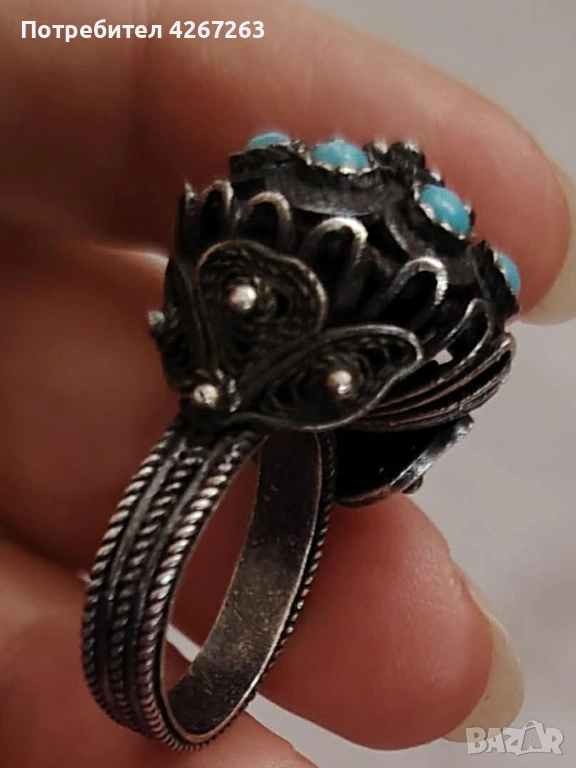 Оригинален сребърен пръстен корона Царство България. Ръчна изработка, без маркировка, тест позитивен за сребро, с натрупана сериозна патина на времето. Кабошончетата имат леко ожулване по най-издадените части. Диаметърът на халката е около 18 мм, като е леко изкривена.
