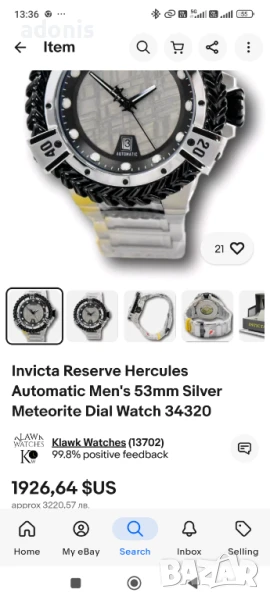 Invicta reserve Hercules automatic 53 mm meteorite Original authentic. Уникален , луксозен и екстравагантен автоматичен механичен часовник Инвикта с циферблат от метеорит. Сейко , прецизен автоматичен, механичен механизъм с възможност и за ръчно навиване. Голям размер на корпуса 55 ММ. Оригинален и автентичен нов , пълен комплект с кутията и възглавничка за часовника. Коронка и заден капак на винт , 20 АТМ. 200 м. Водоустойчив. Топ изпълнение.