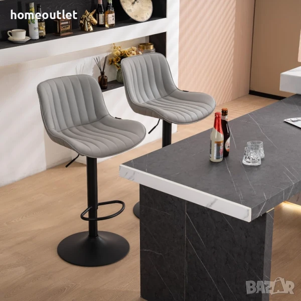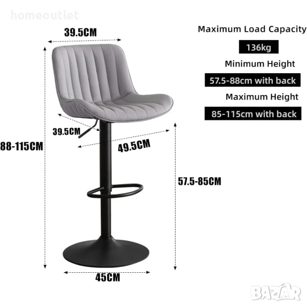 Тези въртящи се на 360° бар столове предлагат голяма стабилност с основа с широк диаметър и също така са оборудвани с гумен пръстен, за да предотвратят надраскване на пода.