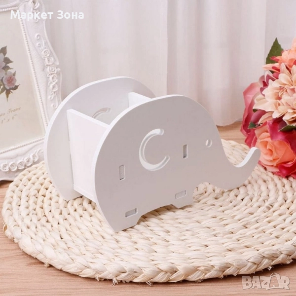 Поставка за съхранение на училищни и офис консумативи – Органайзер с държач за химикалки и телефон във формата на слон. Размери: 18 х 10 х 8 см;Материал: висококачествена пластмаса;Подходяща за съхранение на моливи, химикалки, маркери и други канцеларски материали.Държач за телефон с подвижен механизъм.