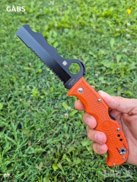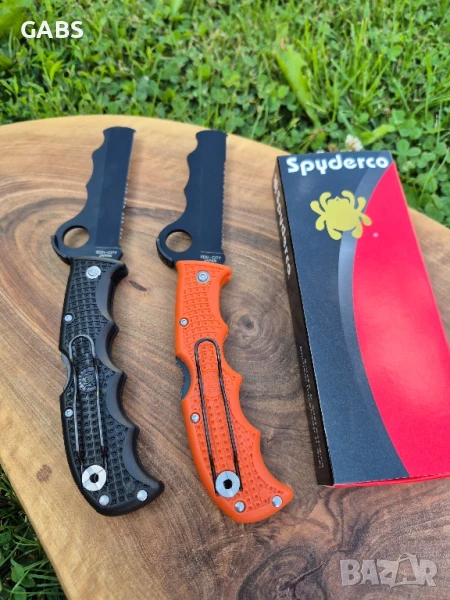 Патентованото острие VG-10 с тъп връх е назъбено осемдесет процента SpyderEdge за агресивно рязане на предпазни колани и влакнести материали. Последният сантиметър от върха Spyderco е оставил PlainEdge за детайлно рязане. Разположен над кръглия отвор, капак Cobra позиционира палеца директно върху отвора за бързо разгръщане на острието, след което служи и като платформа за лост за палеца. Безопасната оранжева FRN дръжка е формовано чудо от двупосочни текстурирани контури и издутини, които ергономично обгръщат дланта ви. В затворено положение, стиснете острието по-дълбоко в дръжката и прибиращ се карбидeн връх стърчи от основата за чупене на стъкло. В затворено положение, стиснете острието по-дълбоко в дръжката и прибиращ се карбидeн връх стърчи от основата за чупене на стъкло. В контрастно черно на гръбнака на дръжката е очертана пронизителна и привличаща вниманието свирка за оцеляване. Носи се с лява/дясна ръка, закопчава се с помощта на щипка .Предлага се в два цвята.