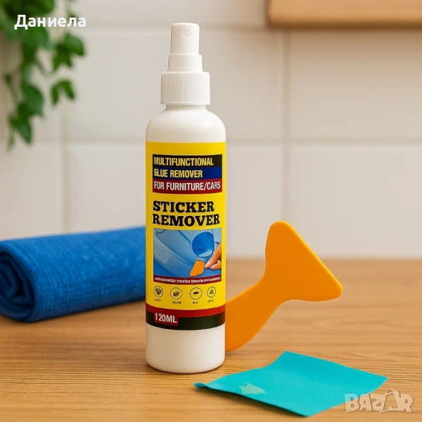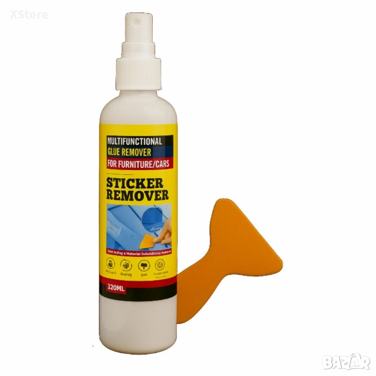 Обем: 120мл;Предназначение: Премахване на стикери, лепила и остатъци от лепкави вещества;Допълнителен инструмент: Ергономичен инструмент за стъргане;Подходящ за: Мебели, коли и други повърхности;Вид на опаковката: Специфичен спрей за лесно нанасяне.
