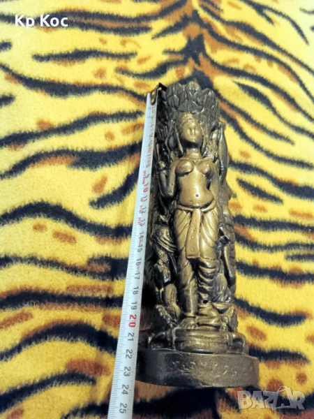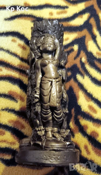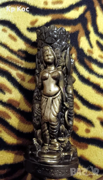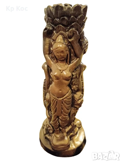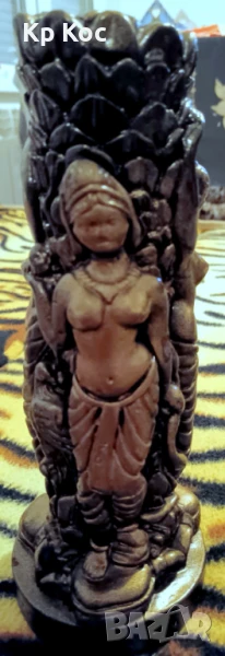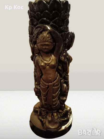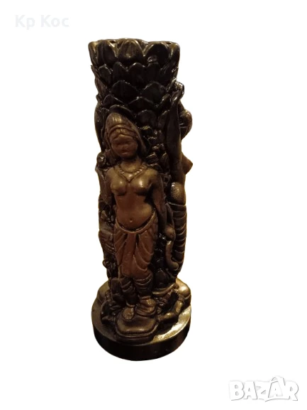 Винтидж свещник с флорални и индуистки орнаменти - с дизайн на древна статуя, украсен с детайлни резби и натоварен със сложна антична символика. Свещникът изобразява три жени божества с животни - орел, куче и змия, срещани в египетската и древната индуистка митологии като символ на космическия ред и конфликт - елементи на противоположни сили, които често са в опозиция и поддържат баланса на света - уникално, привличащо вниманието украшение за домашен декор.