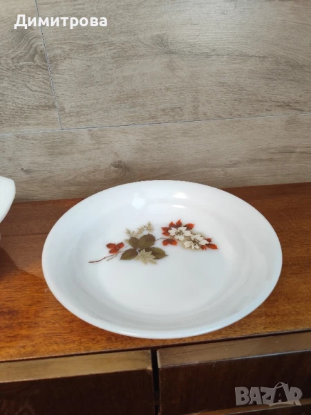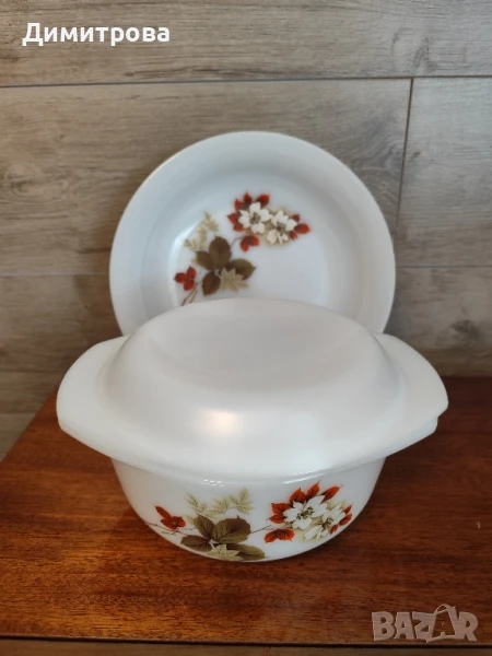 винтидж опалиСтилна кръгла купа с капак 30,5 см., 2.2 л., в бял цвят с рисувани цветя. Подходяща за сервиране на салатa, студена и топла супа. Благодарение на материала (Опал), от който е изработена, тази чиния е по-устойчива при удар, почиства се и се съхранява лесно. Устойчива е и на надрасквания. Подходяща за ползване в микровълнова фурна и съдомиялна машина.Красива касерола ARCOPAL от закалено опалово стъкло с мотив Авила, изобразяващ коледни рози. Може да се използва както от фурната, така и на масата. Двете части могат да се използват поотделно, капакът ще ви позволи да сервирате например зеленчуци.Френската марка е произведена от Verrerie Cristallerie d'Arques.Производственият процес на опалово стъкло е открит през 1958 г. и е регистриран под името Arcopal.Това е стъкло, което е много устойчиво на отчупване и пукнатини.Под касеролата е написано "ARCOPAL France".Отлично състояние.РАЗМЕРИ:Височина 13 см,Диаметър без дръжки 22,5 см,Тегло 1763 кг.