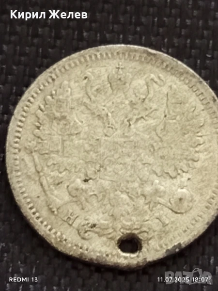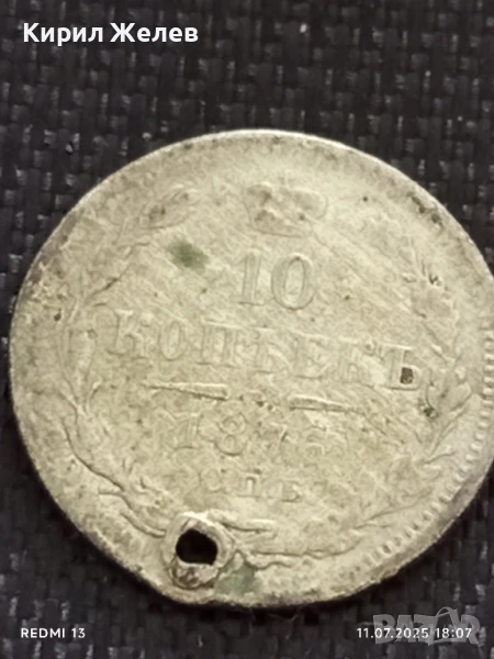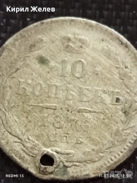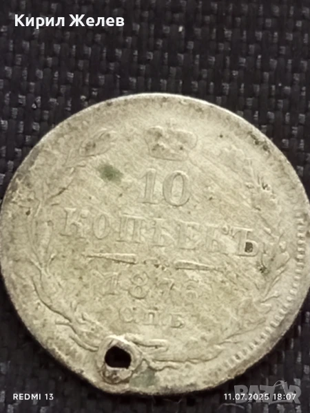 Сребърна монета 10 копейки 1876г. Царска Русия продупчена за НАКИТ, НОСИЯ, КОЛЕКЦИЯ 40338 → Обява 50989911