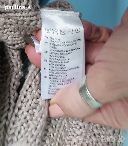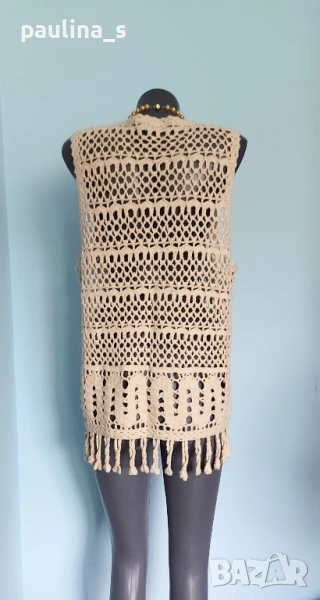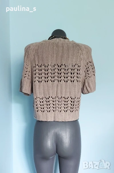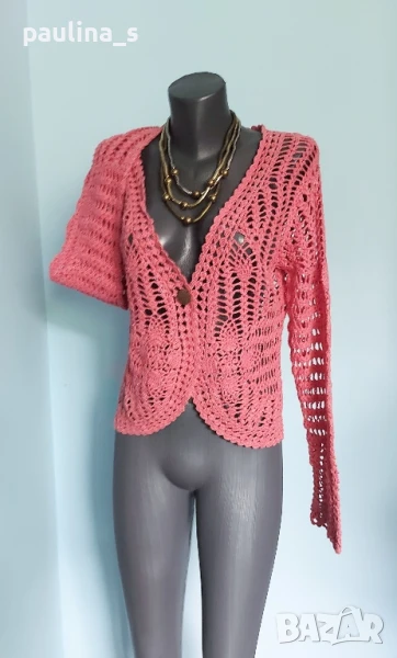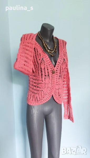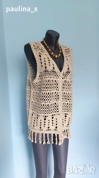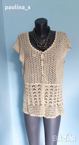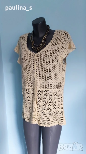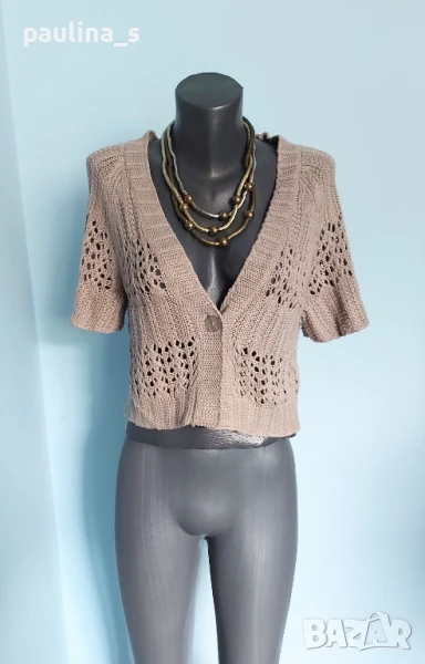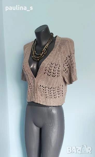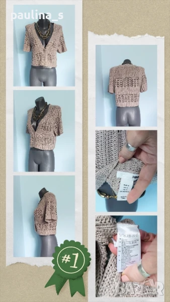 4️⃣ Колаж / ВИНТИДЖ 2004г. L / 3XL - "H&M". Цената е крайна 29,99лв / 15 евро. Къс плетен топ, тип наметка, с реглан ръкави, изключително качествена изработка и аутлук. Плетивото има еластичност и покрива няколко размера. Преждата е 40% памук и 60% вискоза, плетивото дава еластичност до 3XL. Размер по етикет S, но е доста уголемен. Изглежда като дантелена наметка, мека и приятна за допир до кожата. Копче от натурален седеф Абалон, има и резервно. Цветът е неутрален и подхожда на всичко. Не е чисто нов, като нов.