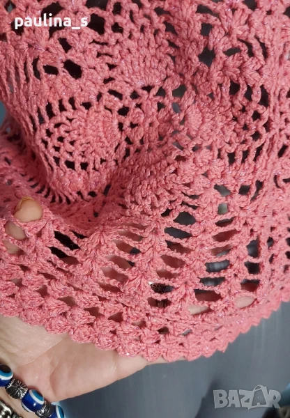 2️⃣ Колаж / Vintage! XL / 3XL - " Carolyn Taylor". Цената е крайна 39,99лв / 20 евро. Дантелен дизайнерски топ или къса наметка, изработка на една кука. Преждата е памучна, с рами и ламе за разкош. Блести на светлина. Дрехата е невероятно романтична като стайлинг и като изработка-една голяма дантелена феерия! Не е чисто нова, но е без дефекти.