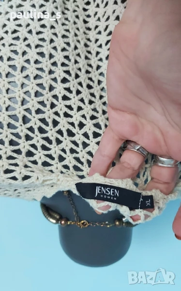 3️⃣ Колаж / XL / 3XL - "Jensen". Винтидж, рядка находка! Цената е крайна 39,99лв / 20 евро. Брандът е дизайнерски, сега не съществува! Дантелена туника тип наметка, изцяло ръчна изработка на една кука. Цветът е Слонова кост, преждата е памук, плетивото дава еластичност и покрива няколко размера, до 3XL. Копчетата са от естествен седеф Абалон, стоят като бижута! Закопчаването е до талията, долу стои свободно. Колието е от затворен магазин на Парфоа и се продава за 15 евро, не е брандирано.