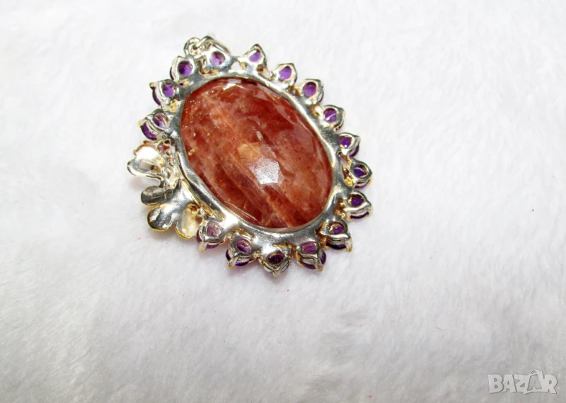 Сребърно голямо колие със слънчев камък 40 карата, размер 48x34x10, произход Африка, тегло 16.9гр. Другите камъни са аметист, турмалин и циркони