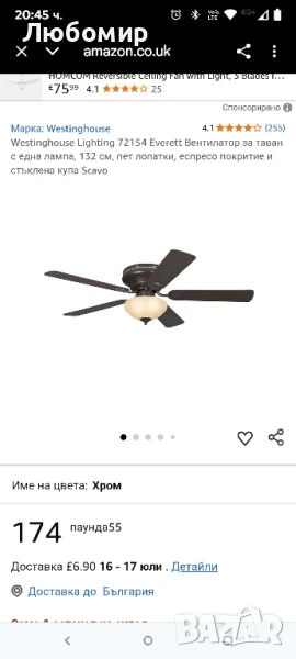 Вентилатор за таван с една лампа, 132 см, пет лопатки, еспресо покритие и стъклена купа Scavo.Вътрешен традиционен таванен вентилатор с диаметър 132 см в цвят еспресо е идеален за помещения до 25 квадратни метра с ниски тавани.