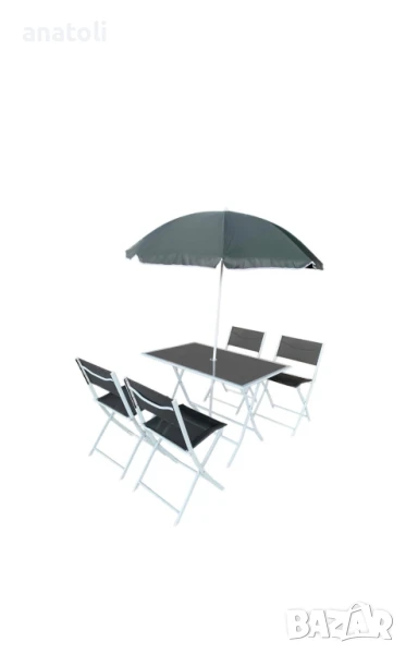 Цена за 1бр. Чисто нови от Германия 8.бр: + маса и чадър 200л Цвят: СивМатериал: Прахово боядисана стомана, тъкан textileneРазмери: 45 x 54 x 86 см (Ш x Д x В)Максимален капацитет на натоварване на място 120 кг издръжлив и устойчив на атмосферни влияния