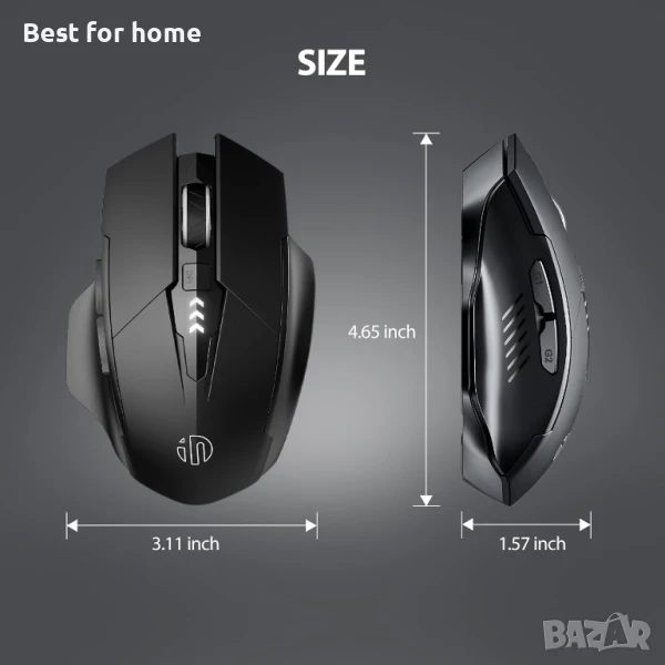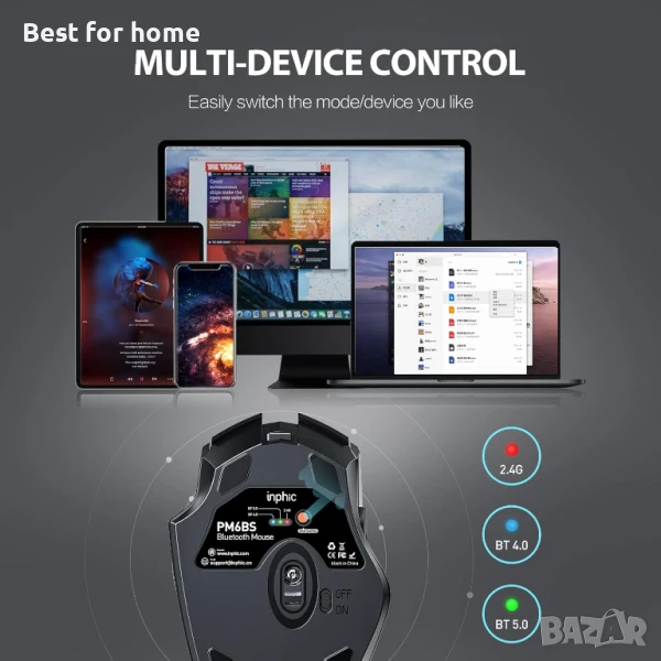 Трирежимна връзка: Inphic Bluetooth 5.0/4.0 и 2.4G USB връзка. Можете да превключите към всеки режим, като щракнете върху бутона за превключване на режима, разположен в долната част на мишката. След като завършите сдвояването на Bluetooth или поставите USB, можете свободно да превключвате към всеки режим, а максималното работно разстояние на всеки режим е 10 метра.