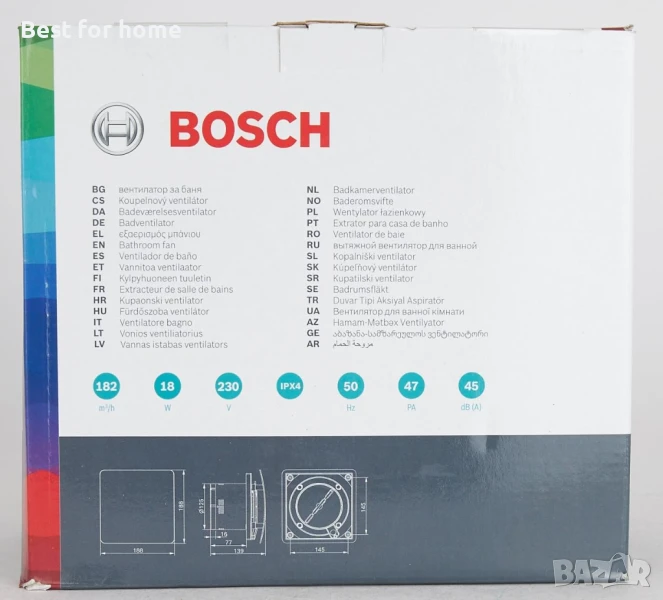 Атрактивен дизайн на Bosch: Елегантен дизайн с преден панел, изработен от висококачествена пластмаса - неутрално бяло, подходящ за всеки интериор на баня. Нивото на шума на 3 м разстояние е 45 db(A)