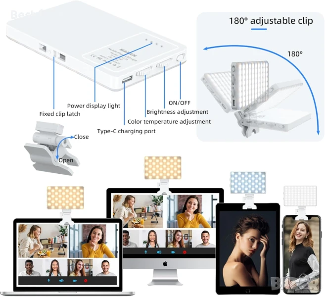 Преносима селфи лампа SHGUMITE с 80 LED диода - предна и задна щипка с 3 режима на осветление - презареждаща се - идеална за грим, камера, стрийминг на живо и влог
