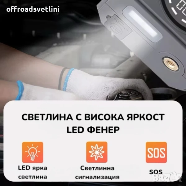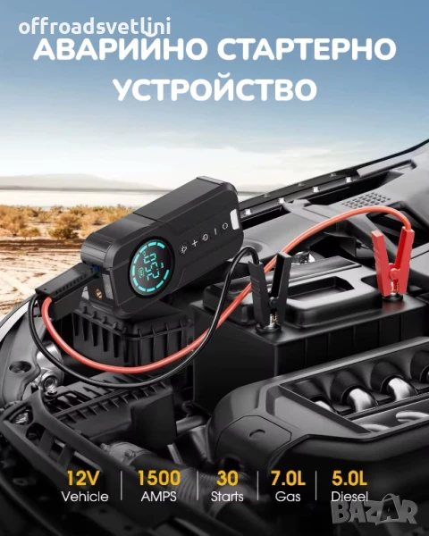 jump starter, 1500A стартер, компресор за кола, аварийно стартиране, стартер за мотори, стартер за джип, стартер за бус, компресор 150PSI, зарядно за кола, стартер с фенер, авто аксесоари, стартер за дизел, стартер за бензин, стартер за каравана