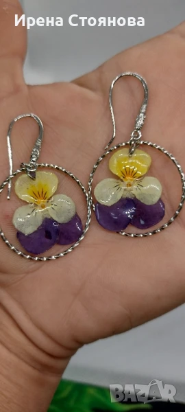 Обеци с естествен цвят на мини градинска теменужка. Цветче с размери 2/2 см. Внимателно изсушени и запечатани в няколко слоя епоксидна смола, така че да им се придаде здравина, запазване на формата и цвета.Всяко цвете е различно и неповторимо, което го прави единствено и уникално.Цена 22 лв.
