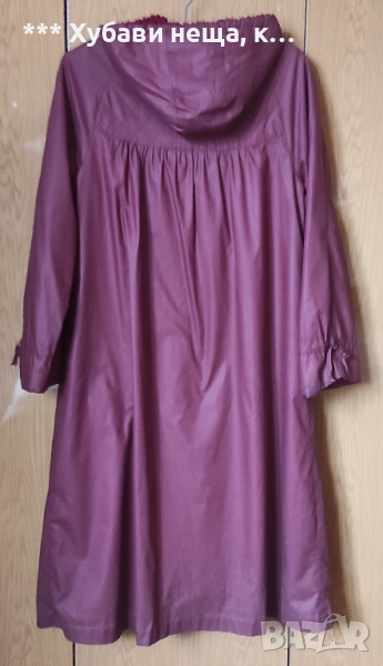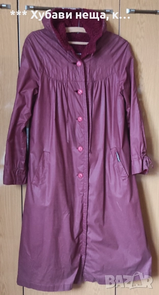 Палто промазан плат, внос от Македония. Подходящо е за по-едра фигура. Елегантно, стои стилно, има набор на платката и прикрива някои несъвършенства на фигурата. Носено е два сезона затова цената е максимално намалена и е символична и ако на някого ще върши работа пишете.