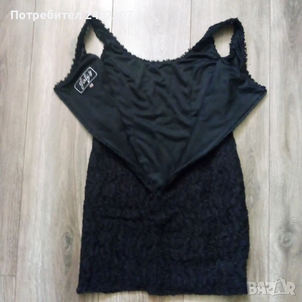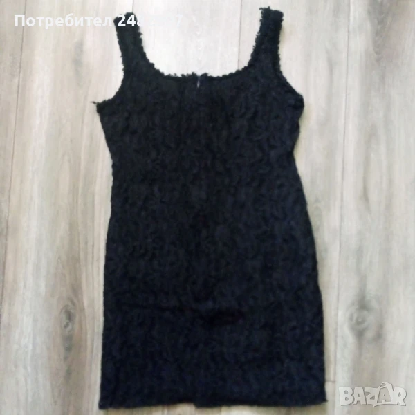 Черна дамска рокля - мини с подплата и скрит английски цип на гърба, размер 36. Съдържа 100 % полиестер. Ширина в раменете - 30 см, ширина под мишниците - 38 см, ширина в долната част - 45 см, дължина от рамото до долу - 70 см, дължина на ципа отзад - 37 см. Много запазена, почти не е използвана.