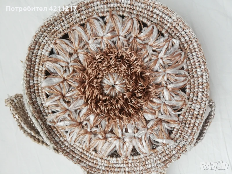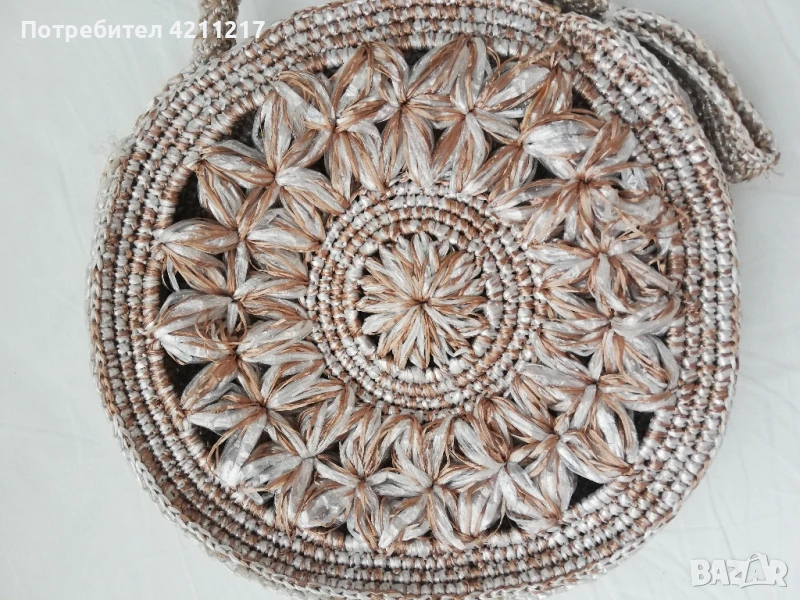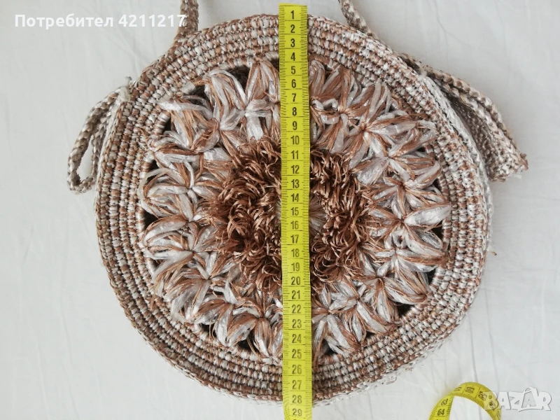 Лятна дамска чанта, плетена, изкуствена материя тип сизал. Като се срежат ограниченията , дългата дръжка е 87 см..Произведена в Русия.