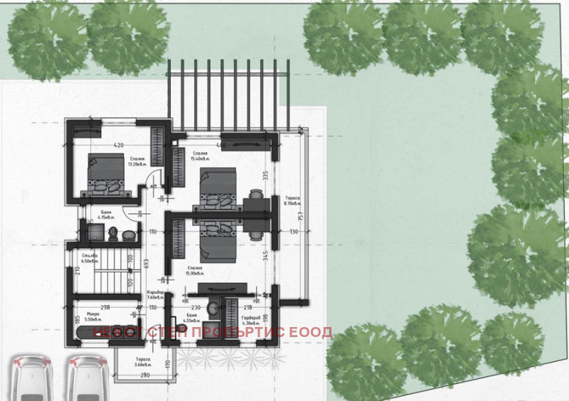 Втори етаж: Три спални (едната със собствена баня и гардеробна), още една баня с тоалетна, мокро помещение и панорамна тераса.
