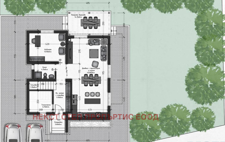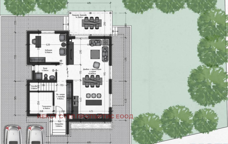 Първи етаж: Дневна с кухня и трапезария (40 кв.м.), кабинет/четвърта спалня (14 кв.м.), баня с тоалетна и веранда (15 кв.м.).