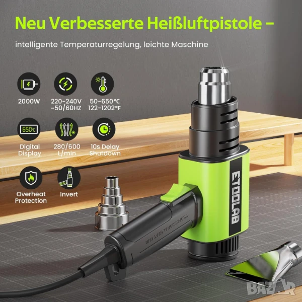 Пистолет за горещ въздух ETOOLAB 2000W темп 50-650°C с LCD дигитален дисплей