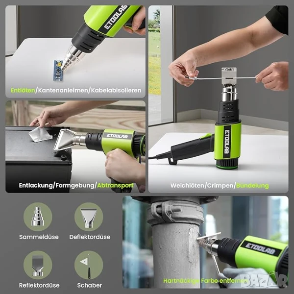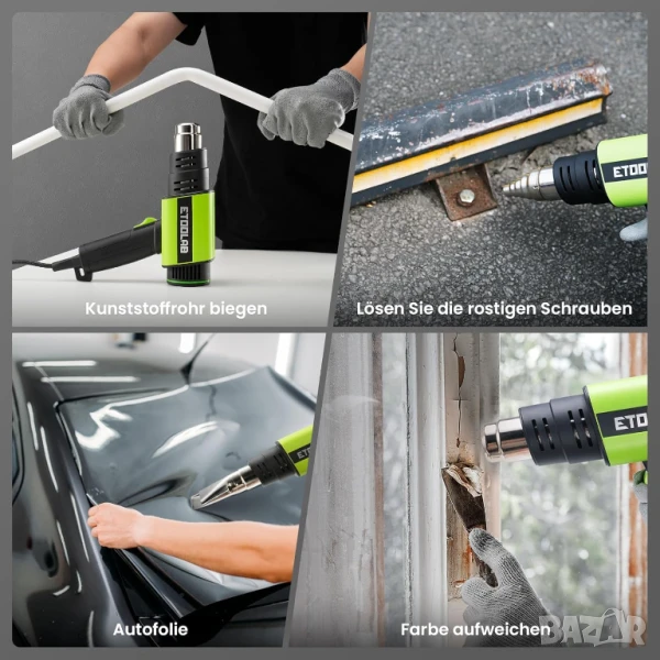 Идеален за топене на пяна, отстраняване на лепило, огъване на PVC, за свиване на термосвиваеми тръби, за свиване на фолио, за автомобилни опаковки, засъхнала боя, за отстраняване на електронни компоненти от печатни платки, размразяване на замръзнали тръби, запалване на дървени въглища и разхлабване на отворени ръждясали болтове и т.н.