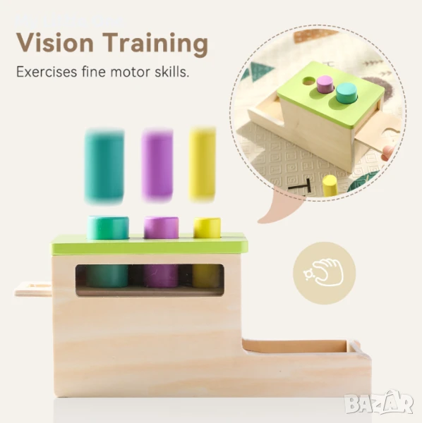 Подобрява координацията око-ръка и основните умения за решаване на проблеми. Тази играчка също така въвежда концепцията за разпознаване и броене на цветовете.