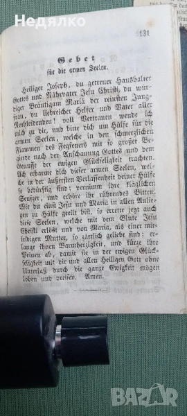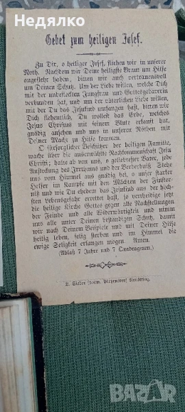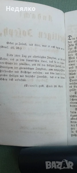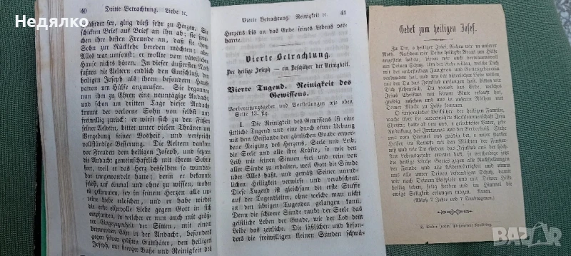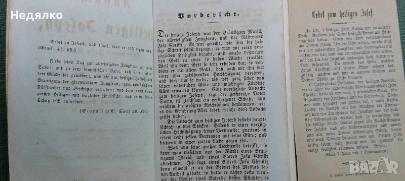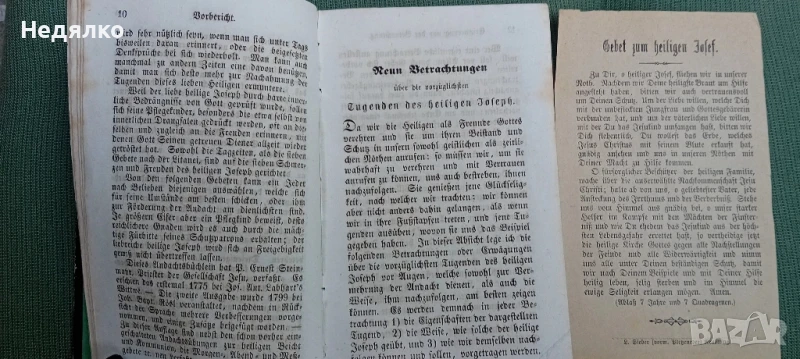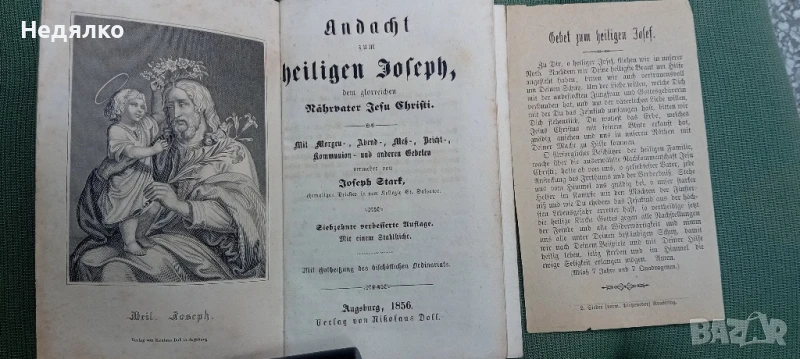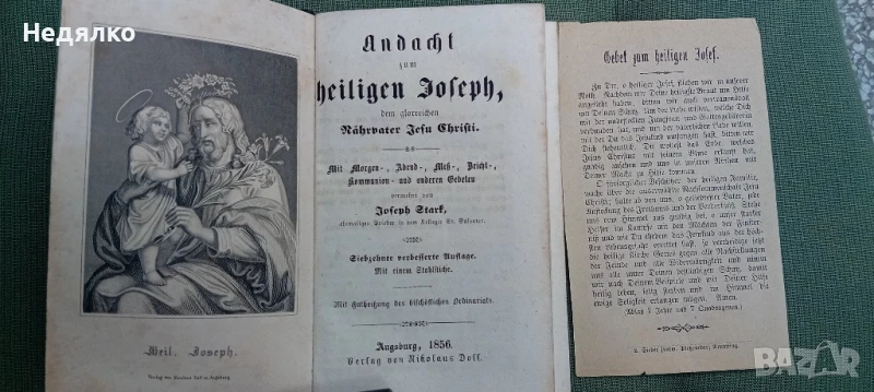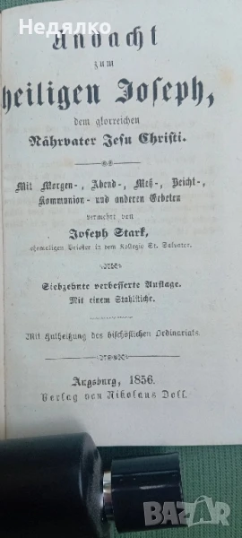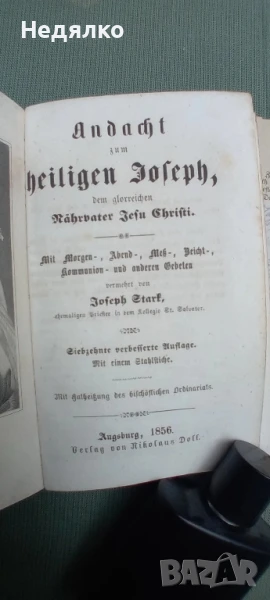В отлично състояние, без липси, скъсано и надраскване, 15,5х10 см,твърди корици, 216 страници.Посвещение на Свети Йосиф,славния .хранител на Исус Христос,сутрешни,вечерни литургии,молитви и други.Допълнена от Йозеф Щарк,бивш свещеник в колежа Свети Салватор,с една гравюра върху стомана,публикувана от Николаус Дол с одобрението на епископска ординария. С една отделна страница-притурка и отметка с ръкопис.